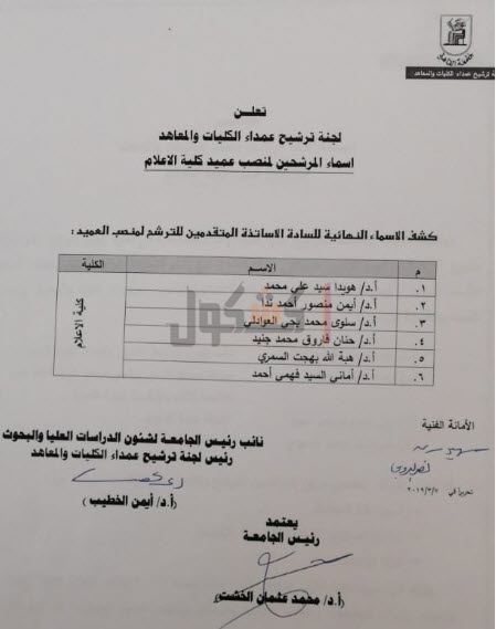 جامعات ننشر القائمة النهائية للمترشحين لمنصب عميد إعلام القاهرة أحمد كمال الثلاثاء 26/مارس/2019 - 09:39 م 3/26/2019 9:39:00 PM طباعة أعلنت جامعة القاهرة قائمة بالأسماء النهائية لمنصب عميد كلية الإعلام بالجامعة، حيث تضم 6 أسماء يتم اختيار العميد الجديد للكلية من بينهم. وضمت الأسماء التالي: facebook twitter whats شارك