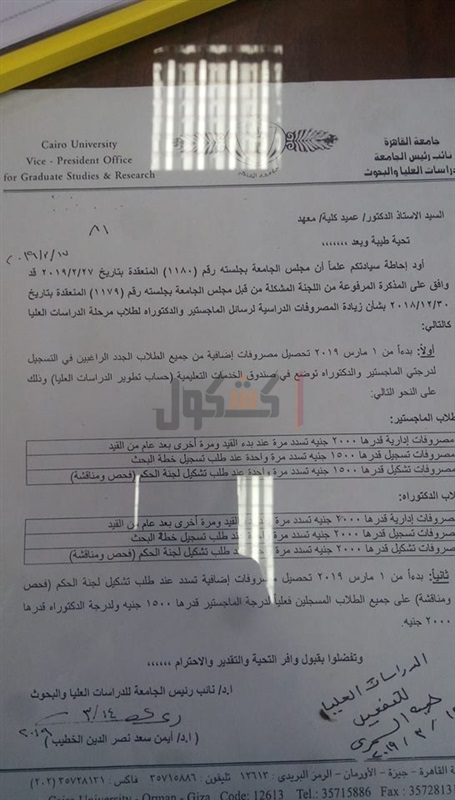 - طلاب الدكتوراه "مصروفات إدارية قدرها 2000 جنيه