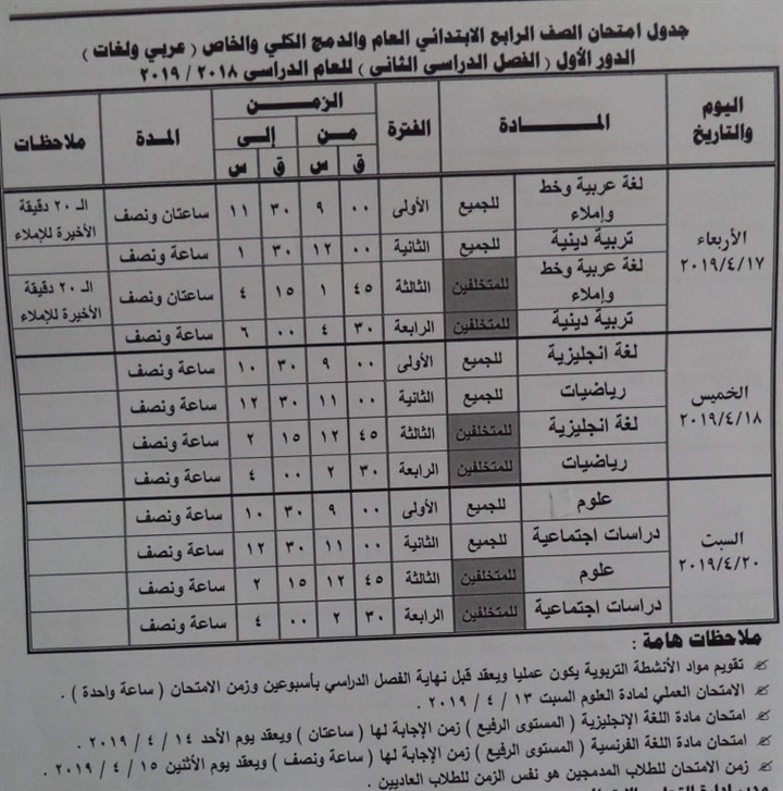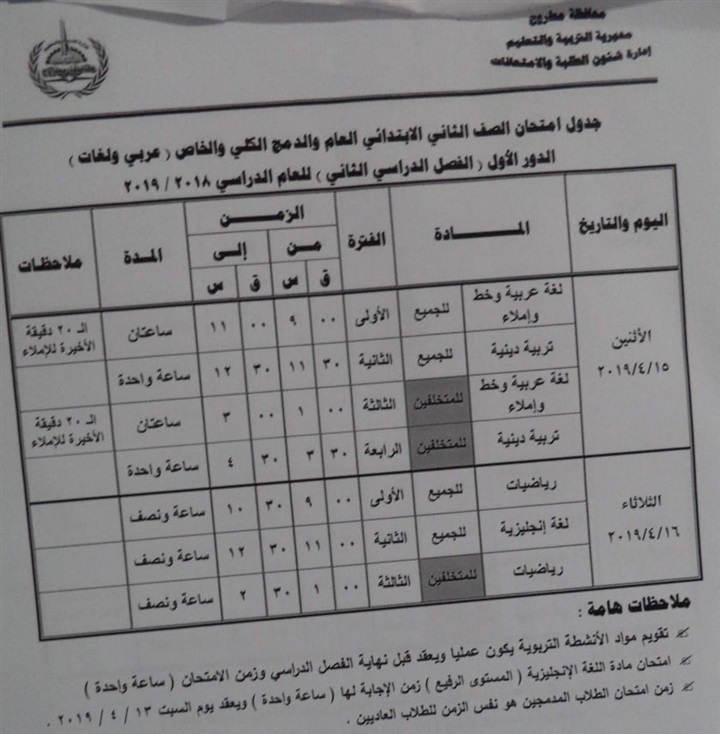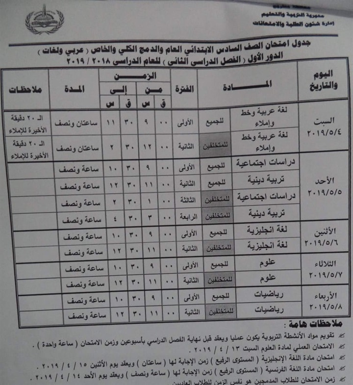نشرت اليوم مديرية التربية والتعليم بمحافظة مطروح جدول امتحانات الفصل الدراسي الثاني للتعليم الابتدائي عام ومهني، الدور الاول والمتخلفين من الفصل الدراسي الاول.