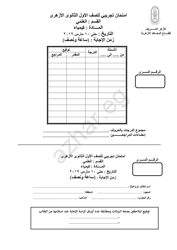 بالصور.. تعرف على شكل امتحان الكيمياء لطلاب الأول الثانوى الأزهرى