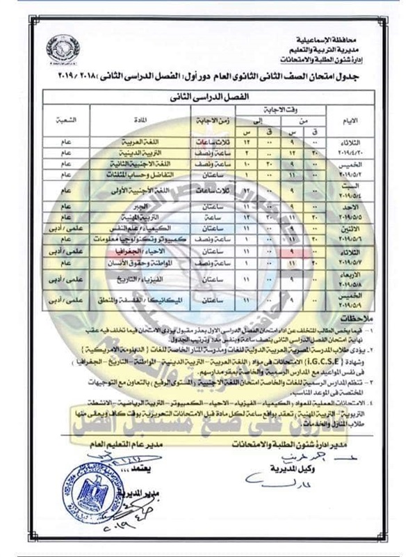 ننشر جدول امتحانات نهاية العام للصف الثاني الثانوي بالإسماعيلية