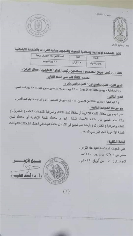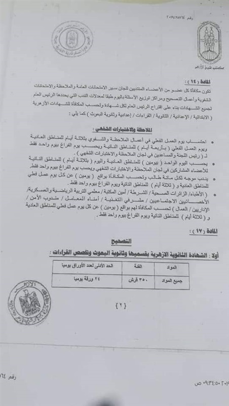 قرر فضيلة الإمام الأكبر الدكتور أحمد الطيب شيخ الأزهر، تعديل ضوابط مكافأة امتحانات الشهادات الأزهرية "ابتدائية - إعدادية - ثانوية - قراءات - إعدادية وثانوية البعوث"، على النحو التالي:
