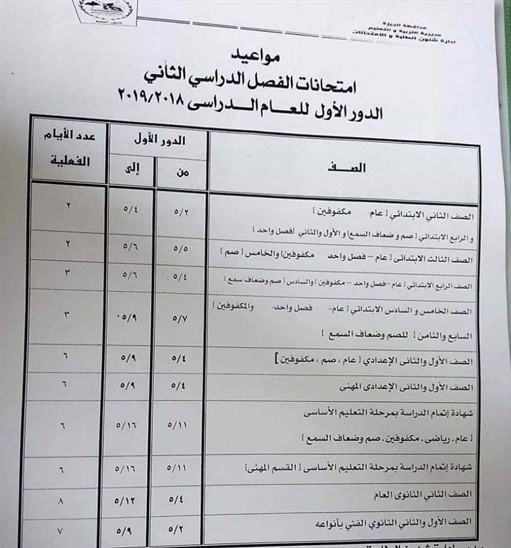 وأشار مدير المديرية أن امتحانات الصف الثاني والثالث الابتدائي وما يعادلها ستتم على مدار ايام الثلاثاء والأربعاء والخميس الموافق 30/4 وحتى الثانى من مايو ، ومن الثلاثاء 30/4 وحتى الاحد 5/5 للصف الرابع الابتدائى، على ان تبدأ امتحانات النقل للتعليم الفنى من الخميس للاثنين ( 2 الى 13/5/2019)
