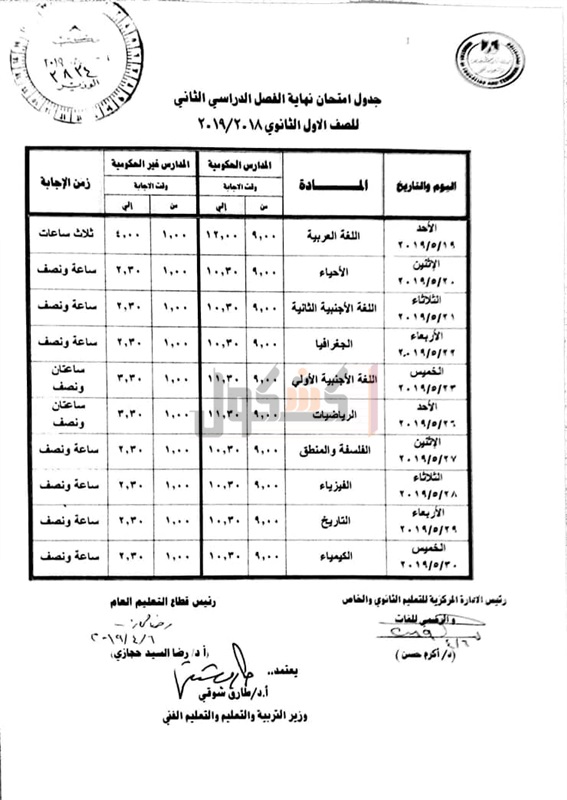 ننشر جدول امتحانات مايو للصف الأول الثانوي