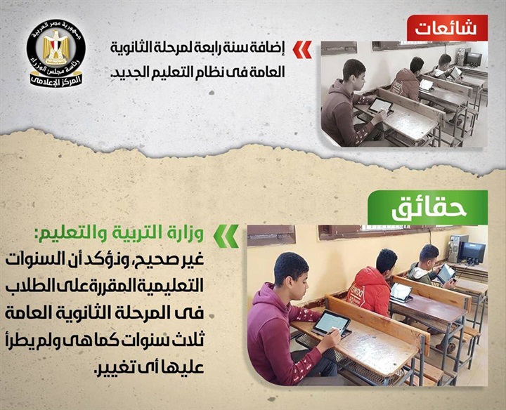 كشف المركز الأعلامي لرئاسة مجلس الوزراء، حقيقة ما تردد عن إضافة سنة رابعة لمرحلة الثانوية العامة فى نظام التعليم الجديد .