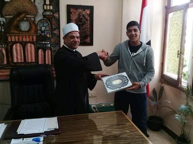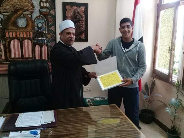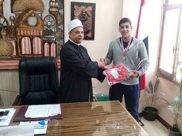 و كرَّم الشيخ نشأت الصاوي رئيس الإدارة المركزية بالمنطقة الأزهرية، الطالب وقدم له شهادة تقدير وبعض الجوائز، وذلك بحضور الشيخ خليفة الدهراوي شيخ معهد بنين محمد رجب، و محمد أشرف موجه عام التربية الرياضية.
