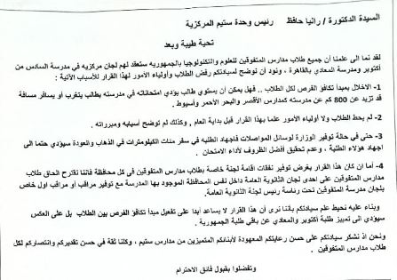 وجه طلاب وأولياء أمور مدارس المتفوقين للعلوم والتكنولوجيا "STEM" بأسيوط استغاثة عاجلة للدكتورة رانيا حافظ رئيس وحدة ستيم المركزية ، أكدوا خلالها أنه نمى لعلمهم أن جميع طلاب مدارس المتفوقين للعلوم والتكنولوجيا بالجمهورية ستعقد لهم لجان مركزية في مدرسة السادس من أكتوبر والمعادى، مشيرين إلي أنهم رفضوا ذلك القرار.