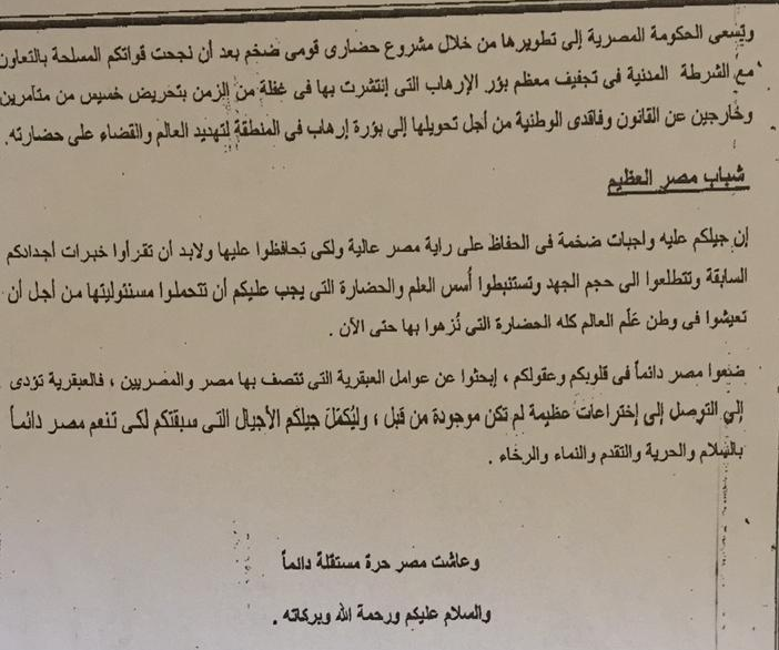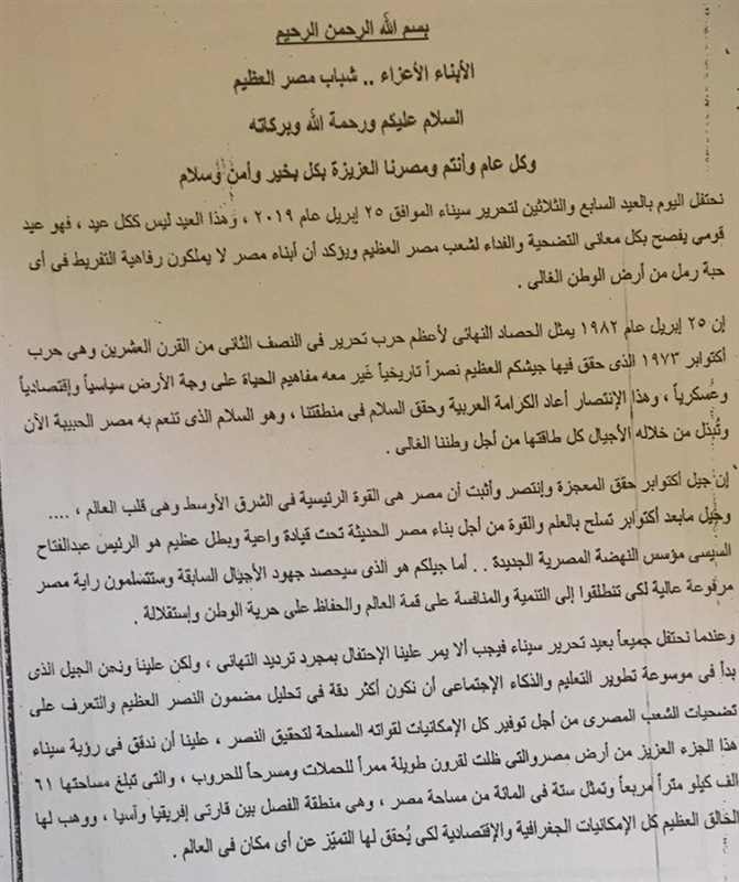 وجهت قيادة قوات الدفاع الشعبي والعسكري ووزارة التربية والتعليم ممثلة بمديرية التربية والتعليم بجنوب سيناء، ضرورة التأكيدعلى جميع مدارس المحافظة يوم الثلاثاء 16 /4 /2019 إلقاء كلمة بطابور الصباح بمناسبة العيد السابع والثلاثين لتحريرسيناء .