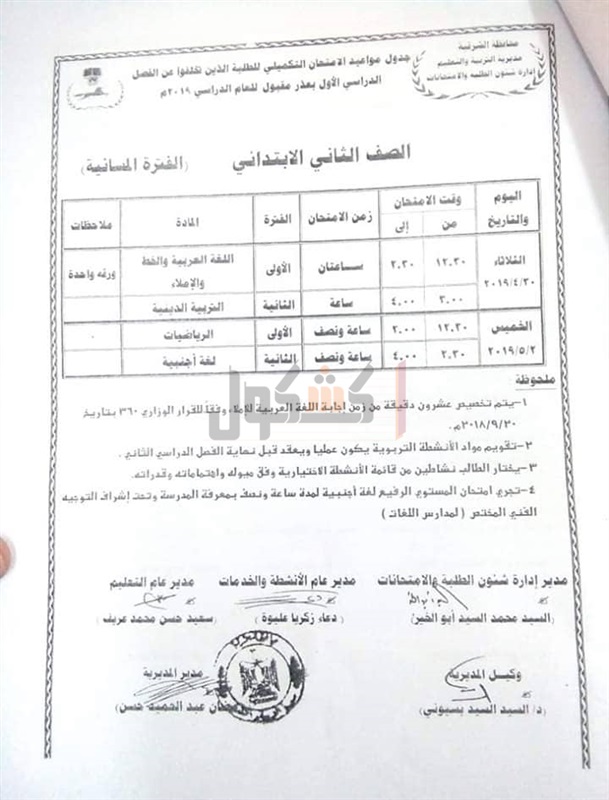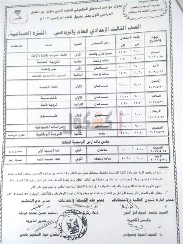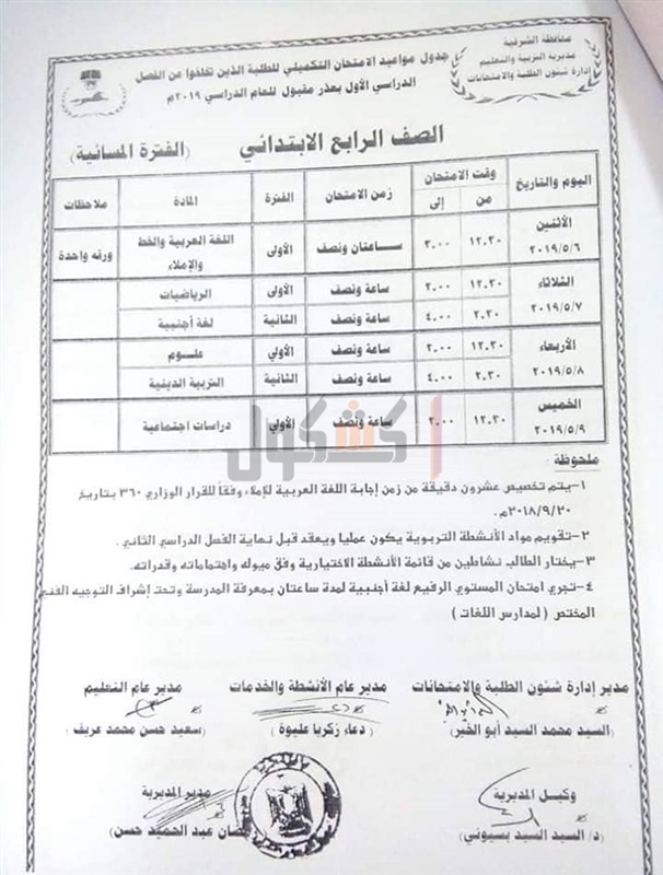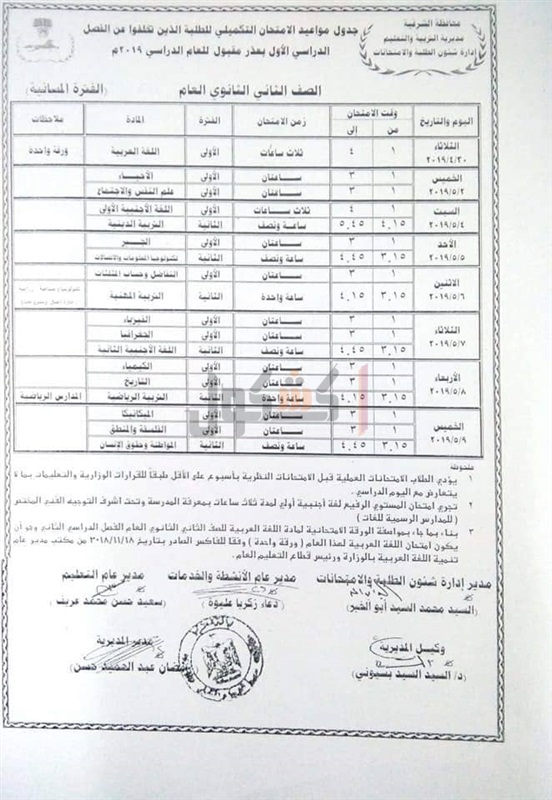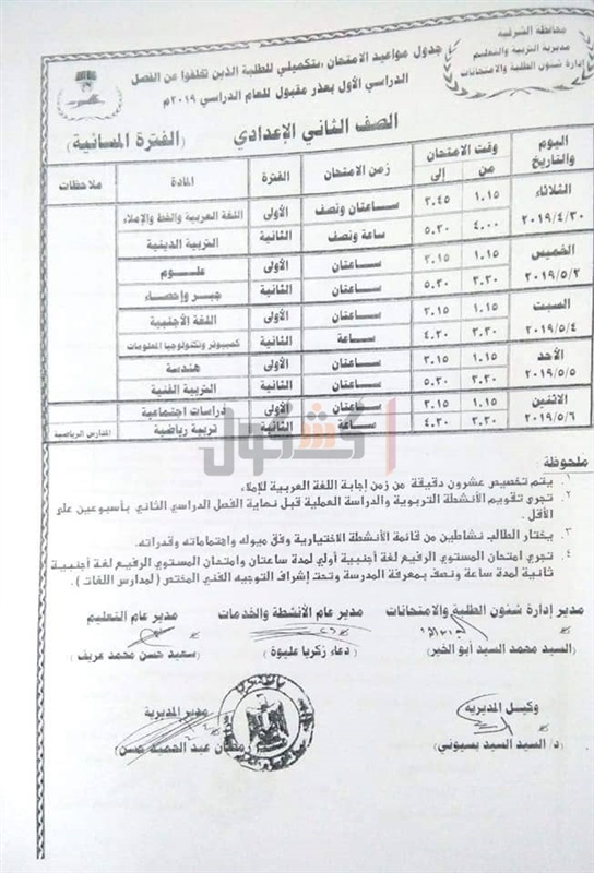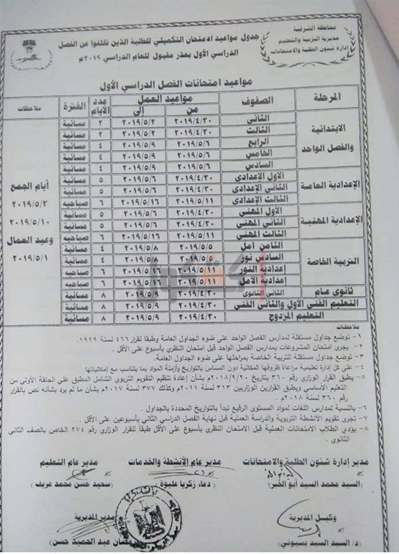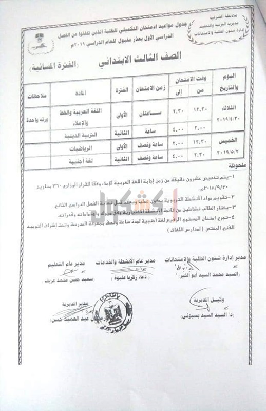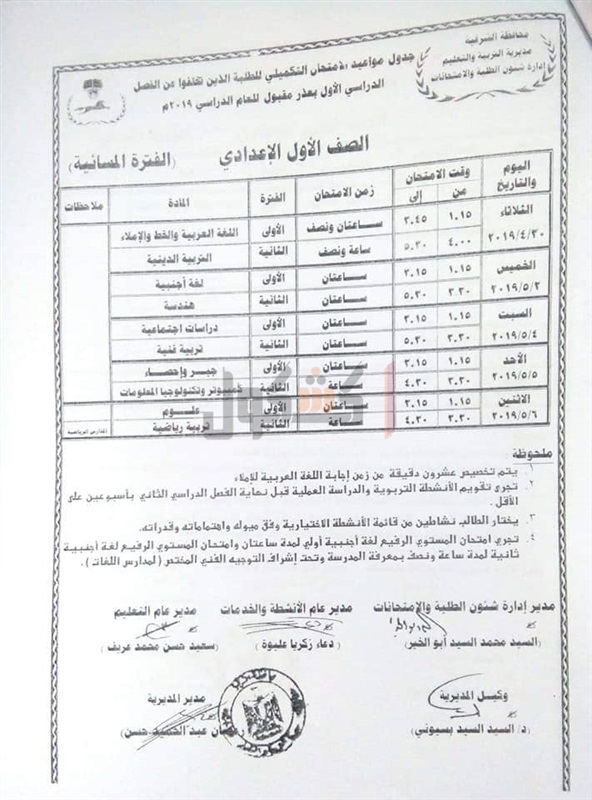 ننشر جدول امتحانات المتخلفين بعذر مقبول في امتحانات الترم الأول