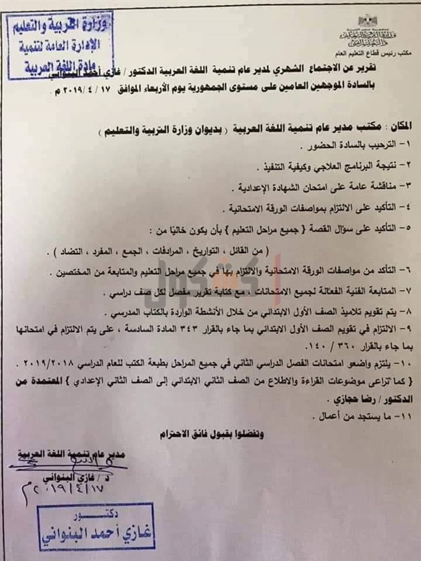 أعلن مكتب مدير عام تنمية مادة اللغة العربية الدكتور غازى البنواني، تقرير الاجتماع الشهري مع موجهي العموم علي مستوي الجمهورية، اليوم الأربعاء.