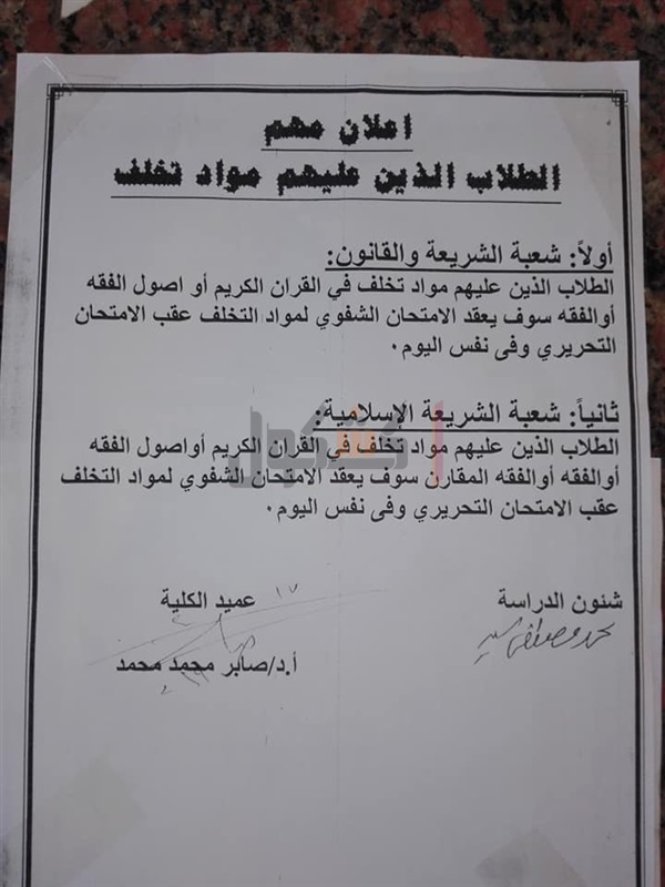 ووفقًا للمنشور الذى حصلت عليه كشكول، أن جميع طلاب جامعة الأزهر المتخلفين عن امتحانات الأعوام السابقة، سيؤدون امتحانهم فى نفس يوم الامتحان التحريرى.