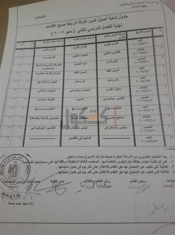ننشر جداول امتحانات نهاية العام بـ"دراسات إسلامية" بنات السادات