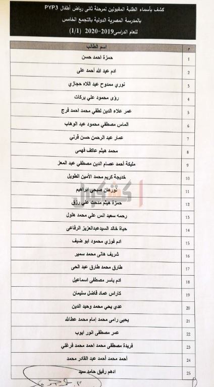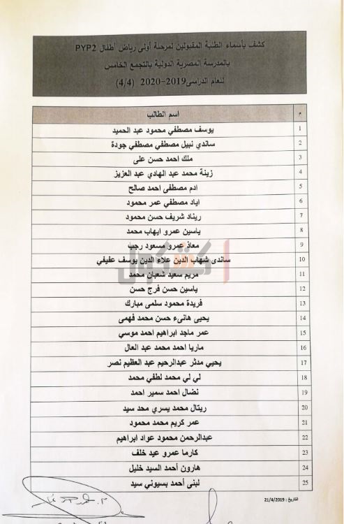 أعلنت المدرسة المصرية الدولية بالتجمع الخامس، أسماء الطلاب المقبولين للالتحاق مبدئياً بمرحلة رياض الأطفال للعام الدراسي القادم 2019/2020.