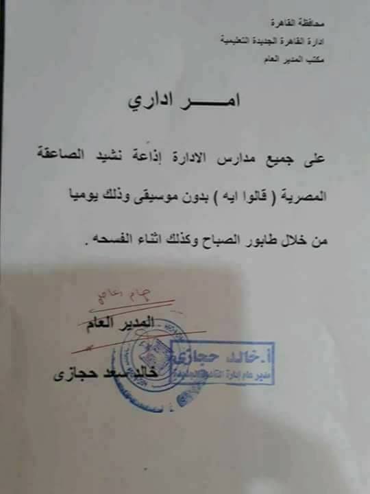 تداول رواد مواقع التواصل الاجتماعي، صرة لأمر إداري أصدره خالد حجازي مدير إدارة القاهرة الجديدة التعليمية، يوجه جميع مدارس الإدارة بإذاعة نشيد الصاعقة المصرية "قالو إيه" بدون موسيقى، وذلك يوميًا خلال طابور الصباح وأثناء الفسحة المدرسية.