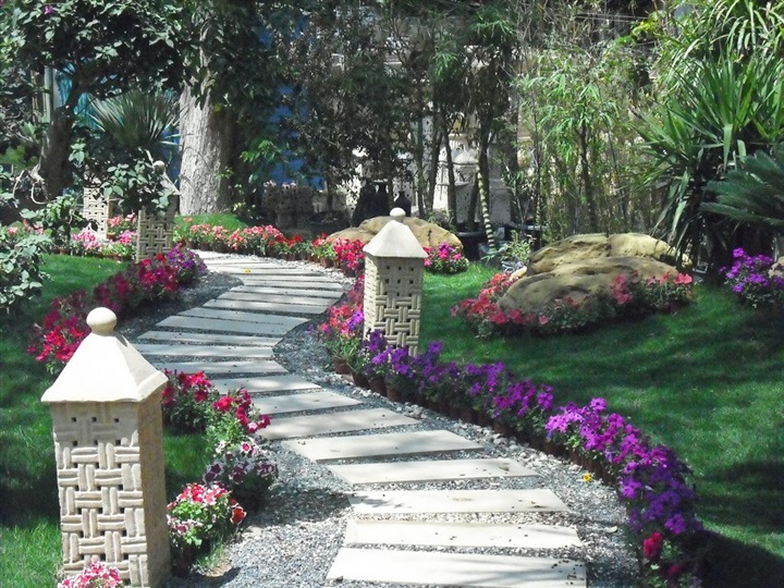 من الأشجار والنباتات الخضراء، كما يوجد بها عدد كبير من تماثيل المشاهير، منها