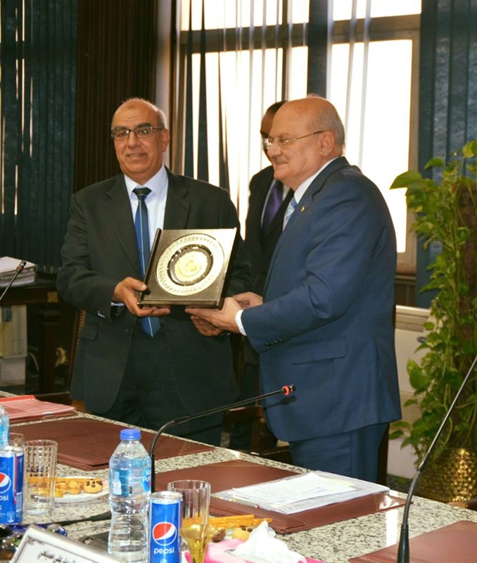 أمين عام الجامعة وقدم له الدكتور خالد عبد الباري درع الجامعة لبلوغة السن القانونية