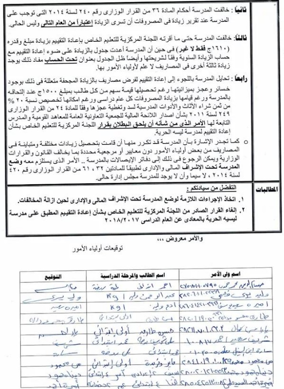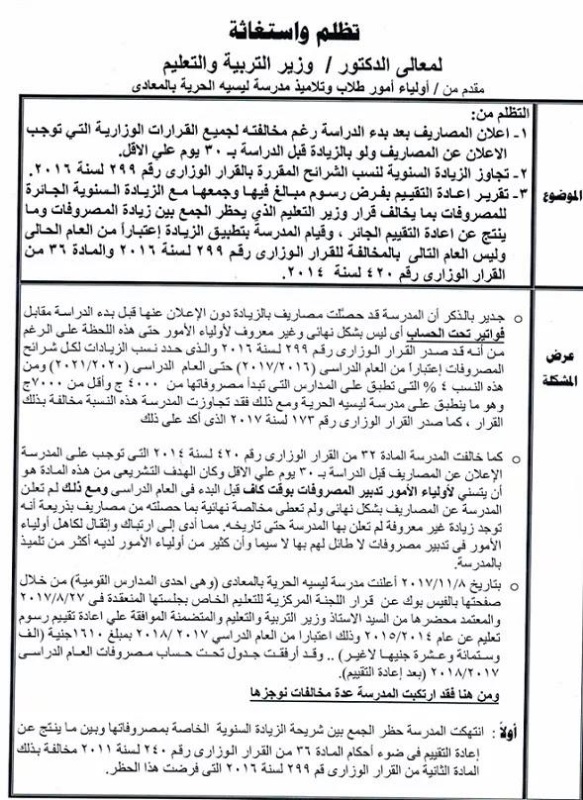أولياء أمور طلاب وتلاميذ مدرسة "ليسيه الحرية" بالمعادى استغاثة للدكتور