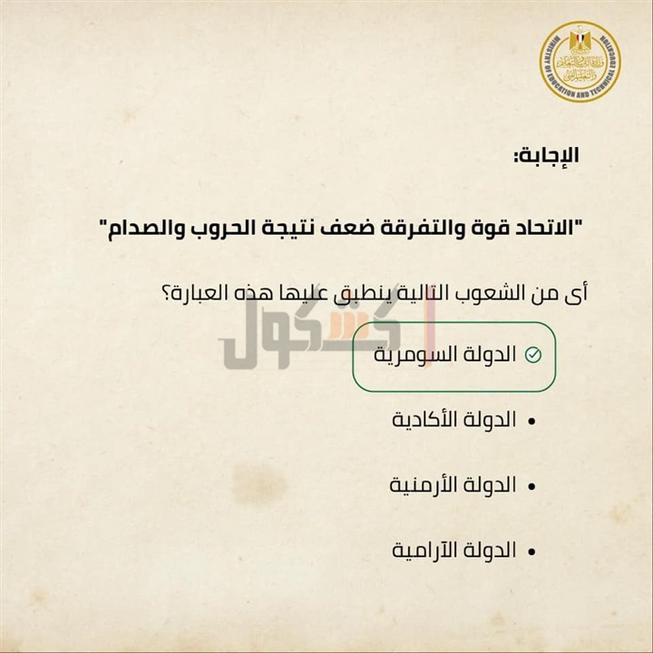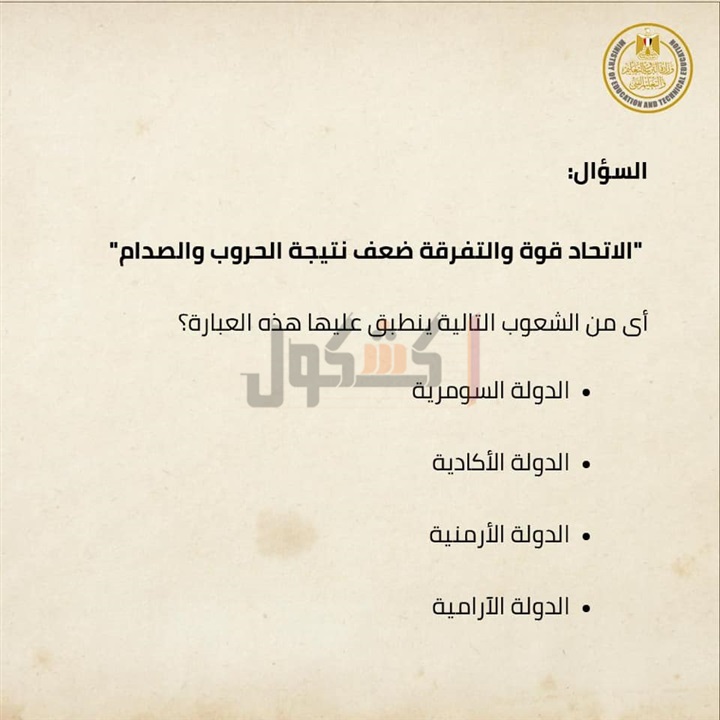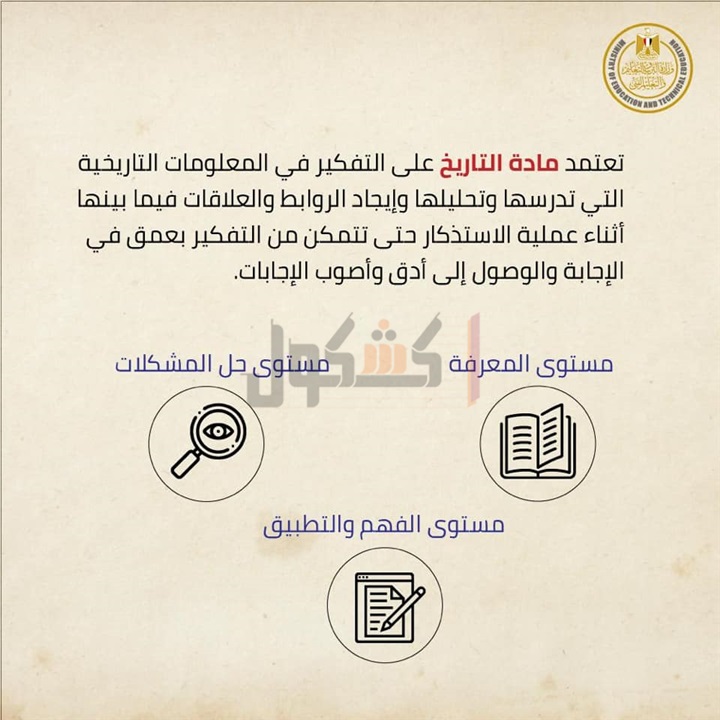 نشرت وزارة التربية والتعليم والتعليم الفني، نموذجا إسترشاديا للطريقة الجديدة للوصول لإجابة سؤال امتحان مادة التاريخ للصف الأول الثانوي باللغة الفرنسية، والذي يعتمد على فهم المحتوى الدراسي والتفكير النقدي.