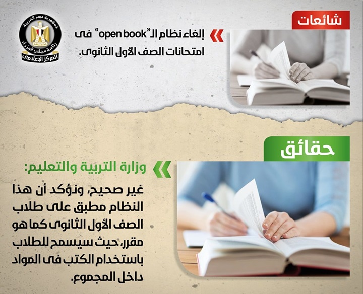 كشف المركز الإعلامي لمجلس الوزراء حقيقة الأنباء التي تم تداولها بشأن تراجع وزارة التربية والتعليم عن تطبيق نظام الـ "open book"، فى امتحانات نهاية العام الدراسى للصف الأول الثانوى بالنظام التعليمى الجديد، تواصل المركز مع الوزارة، والتي نفت تلك الأنباء بشكل قاطع.