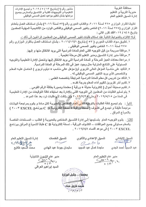 الإلتزام بعدة ضوابط عند استلام طلبات تغيير المسمي الوظيفي من المعلمين