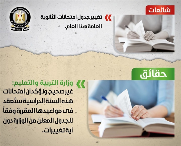 كشف المركز الإعلامى لمجلس الوزراء، إنه فى ضوء ما تردد من أنباء تفيد قيام وزارة التربية والتعليم بتغيير جدول امتحانات الثانوية العامة هذا العام، تواصل المركز مع وزارة التربية والتعليم والتعليم الفني، والتي نفت تلك الأنباء تماما.