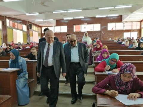 وفي كلية التربية الرياضية بنين تفقدا لجان امتحانات الفرقة الثانية ويؤدي امتحان مادة التدريب 732 طالبا ولجنة خاصة لأحد الطلاب يرافقهما في الجولة الدكتور مجدي الحسيني عميد الكلية.