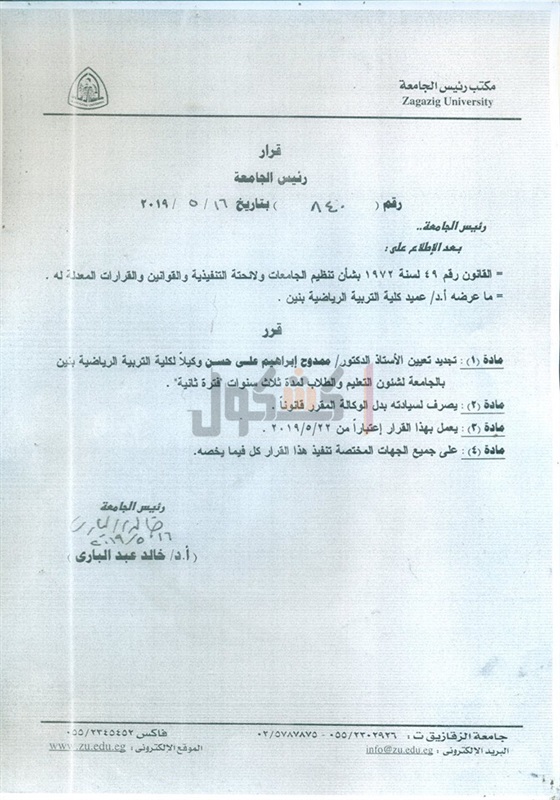 أصدر الدكتور خالد عبد الباري رئيس جامعة الزقازيق القرار رقم 840 الصادر بتاريخ اليوم الخميس 16 مايو 2019، بتجديد تعيين الدكتور ممدوح إبراهيم علي حسن وكيلاً لكلية التربية الرياضية بنين لشئون التعليم والطلاب لمدة ثلاث سنوات "فترة ثانية".