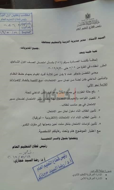إلى مقار التقدير مع الموضوع امتحانات الصف الأول الثانوي هام وتحت رعاية وكلاء الوزارة بالمحافظات شخصياً.