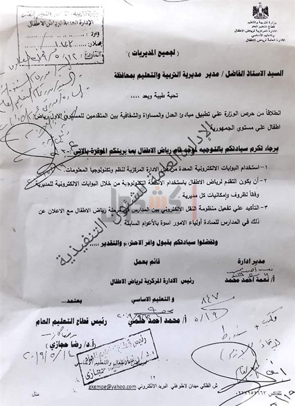 أصدرت وزارة التربية والتعليم، والتعليم الفني خطاب عممته علي المديريات التعليمية أكدت خلاله أنه حرصا من الوزارة علي تطبيق مبايء المساواة والشفافية بين المتقدمين للمستوي الأول رياض أطفال علي مستوي الجمهورية، يرجي