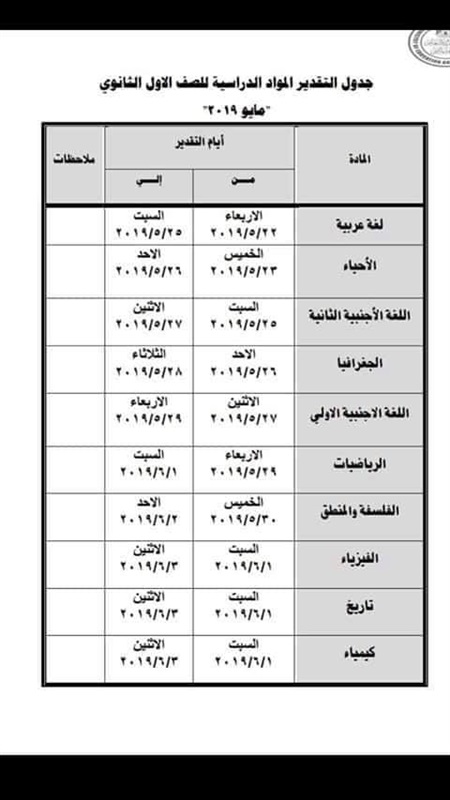 حصل "كشكول" علي مواعيد التقدير الالكتروني لجميع المواد التى يؤدى امتحانها طلاب الصف الأول الثانوي علي التابلت، والتى من المقرر أن تبدأ غدا الأربعاء بتصحيح امتحان اللغة العربية، بينما يتم بدء تصحيح الأحياء يوم الخميس.