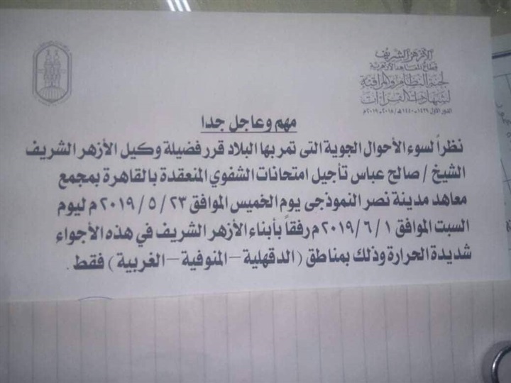 قرر الأزهر الشريف، تأجيل امتحانات الشفوي لشهادات القراءات المنعقدة بالقاهرة لطلاب المعاهد من ثلاث محافظات وهي الدقهلية والمنوفية والغربية، غدا الخميس ليوم السبت 1 يونيو.