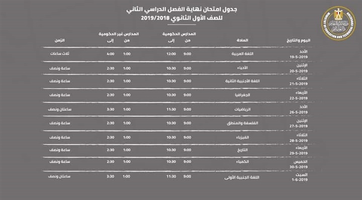 وتعقد امتحانات الفصل الدراسي الثاني للصف الأول الثانوى على فترتين الفترة الصباحية وتضم طلاب المدارس الحكومية والخدمات والمنازل والسجون والمستشفيات، إضافة إلى الفترة الثانية لطلاب المدارس الخاصة والمعاهد القومية.