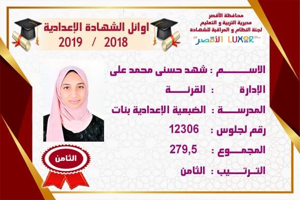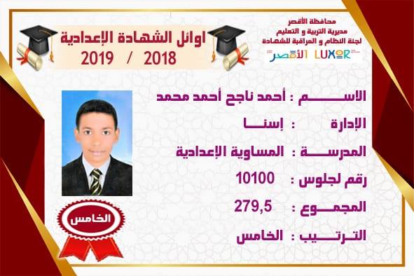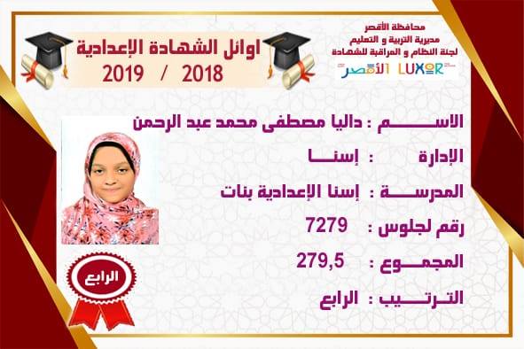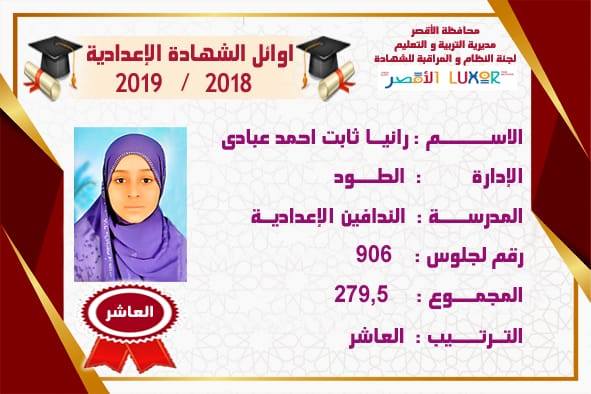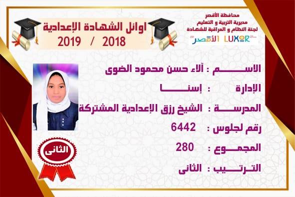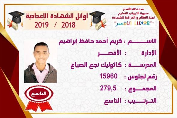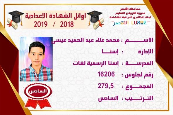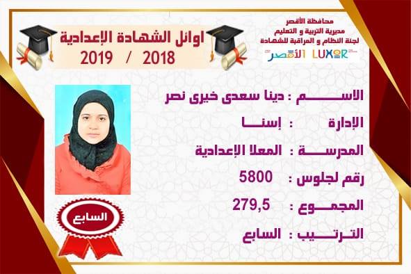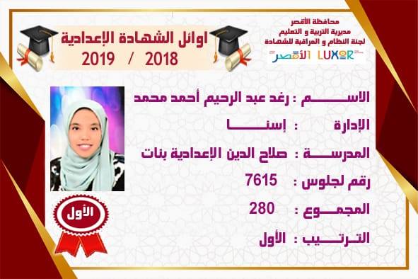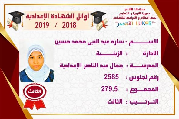 رغد عبد الرحيم أحمد مدرسة صلاح الدين الأعدادية بنات – أسنا، آلاء حسن محمود مدرسة الشيخ رزق الاعدادية المشتركة – أسنا، سارة عبد النبى محمد مدرسة جمال عبد الناصر الاعدادية – الزينية، داليا مصطفى محمد مدرسة أسنا الاعدادية بنات – اسنا، احمد ناجح أحمد مدرسة المساوية الاعدادية – اسنا، محمد علاء عبد الحميد مدرسة أسنا الرسمية لغات – اسنا، دينا سعدى خيرى مدرسة المعلا الاعدادية – اسنا، شهد حسنى محمد مدرسة الضبعية الاعدادية بنات – القرنة، كريم احمد حافظ مدرسة كاثوليك نجع الصياغ – الأقصر، رانيا ثابت احمد مدرسة الندافين الاعدادية – الطود.