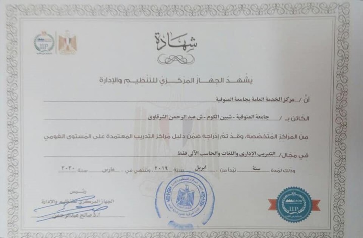 أعلن الدكتور عادل مبارك رئيس جامعة المنوفية أن رئيس الجهاز المركزى للتنظيم والادارة وافق على اعتماد مركز الخدمة العامة بجامعة المنوفية ضمن مراكز التدريب الحكومية ذات الطابع الخاص المعتمدة على المستوى القومى نظرا لما يتمتع به المركز من إمكانيات وتجهيزات عالية المستوى وتنطبق عليه كافة المعايير والشروط الموضوعية لإنشاء مركز تدريبى معتمد.