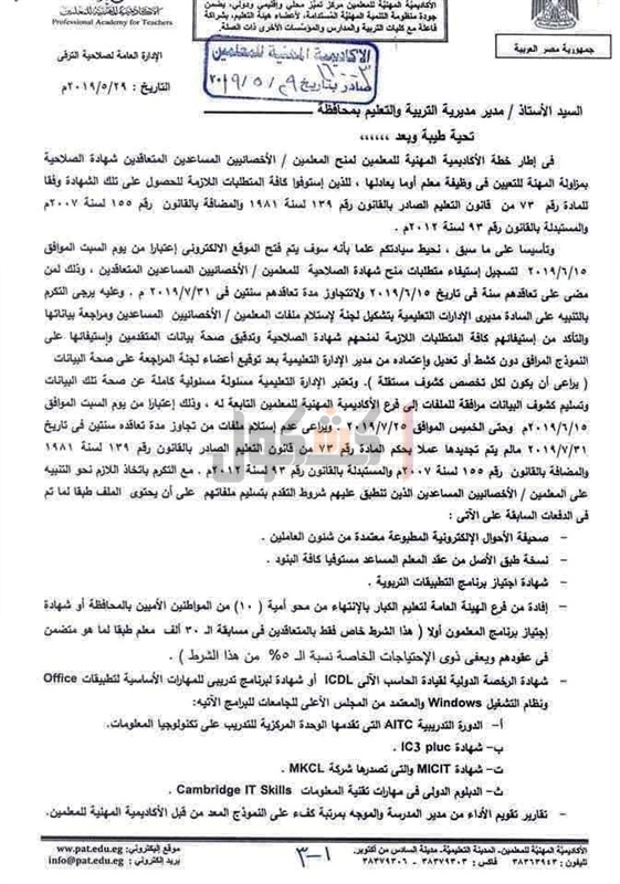أعلنت الأكاديمية المهنية للمعلمين، فتح الموقع الإلكتروني اعتباراً من يوم السبت الموافق 15 يونيه المقبل، وذلك لتسجيل استيفاء منح شهادة الصلاحية للمعلمين/الأخصائيين الاجتماعيين المتعاقدين، وذلك لمن مضي علي تعاقدهم سنة في تاريخ 15يونيه ولا تتجاوز مدة تعاقدهم سنتين في نهاية يوليو.