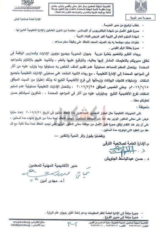 - نسخة طبق الأصل من عقد المعلم المساعد مستوفياً كافة البنود.