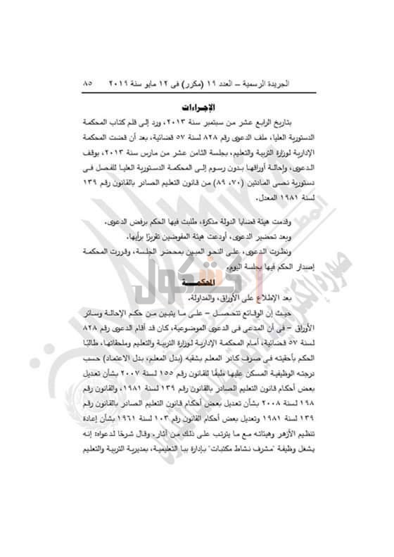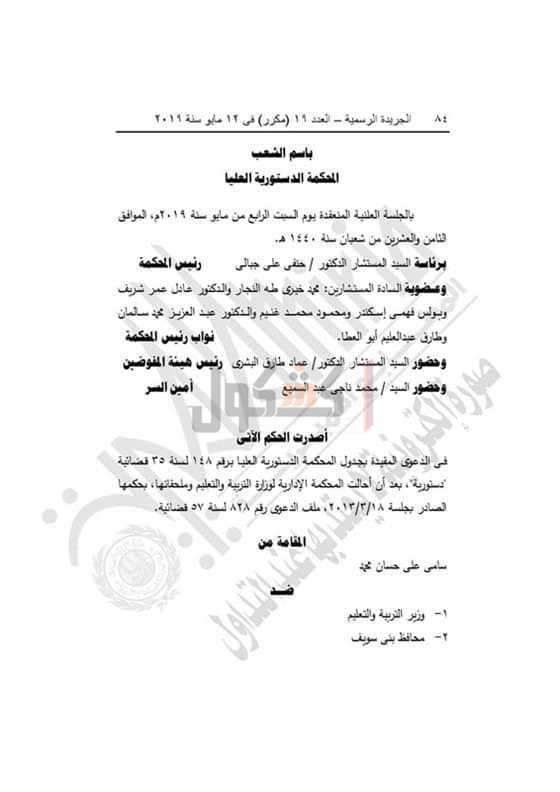 قضت المحكمة الدستورية العليا بعدم قبول الطعن بعدم دستورية نصي المادتين (٧٠ ، ٨٩) من قانون التعليم الصادر بالقانون رقم (١٣٩) لسنة ١٩٨١ المعدل بالقانون رقم (١٥٥) لسنة ٢٠٠٧.