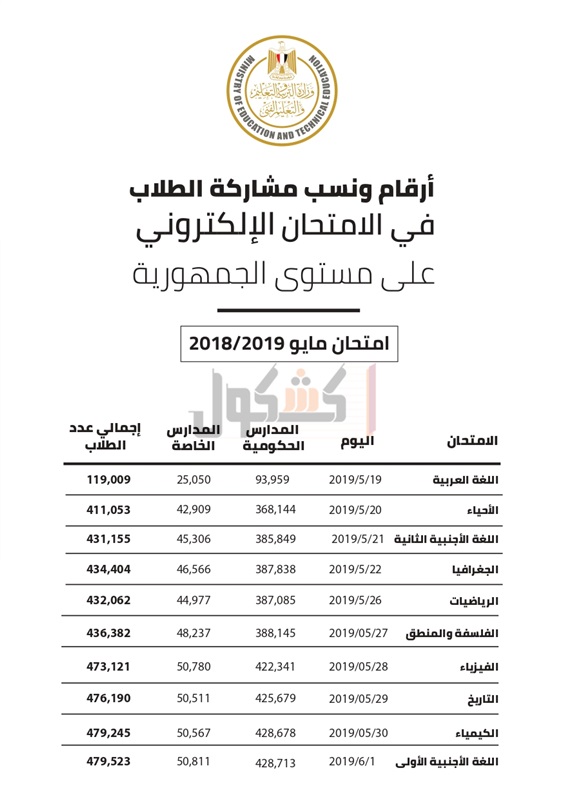 وزارة التربية والتعليم برئاسة الدكتور طارق شوقي، الإحصائية الخاصة باختبارات دور مايو لطلاب الصف الأول الثانوي، والتي اختتمت يوم أول أمس