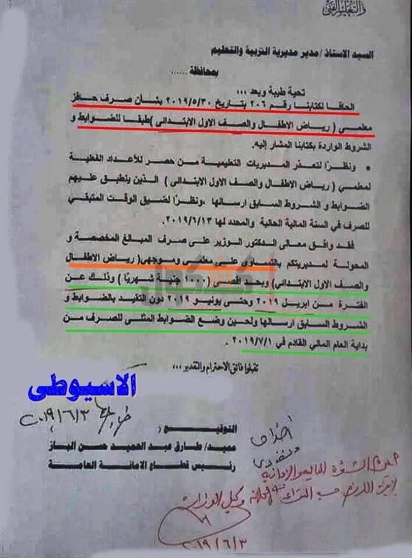 كشف خطاب عممته وزارة التربية والتعليم والتعليم الفني للمديريات التعليمية، أنه الحاقاً للكتاب الدوري رقم 206 بتاريخ 30 مايو 2019، الخاص بصرف حافز معلمي رياض الأطفال والصف الأول الابتدائي طبقاً للشروط الواردة بالكتاب الدوري، بأنه نظراً لتعذر المديريات التعليمية من حصر الأعداد الفعلية لمعلمي رياض الأطفال والصف الأول الابتدائي الذين ينطبق عليهم الشروط، ونظراً لضيق الوقت المتبقي للصرف في السنة المالية الحالية والمحدد لها 13 يونيه الجاري.