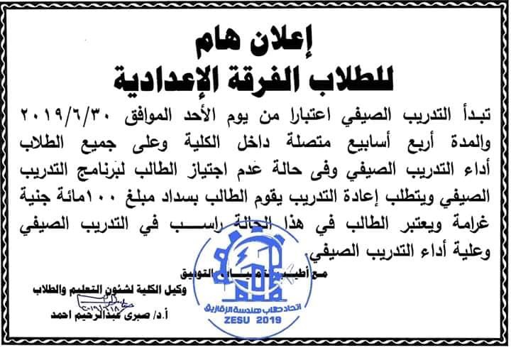 بدء التدريب الصيفي لطلاب إعدادي هندسة الزقازيق ٣٠ يونيو الجاري