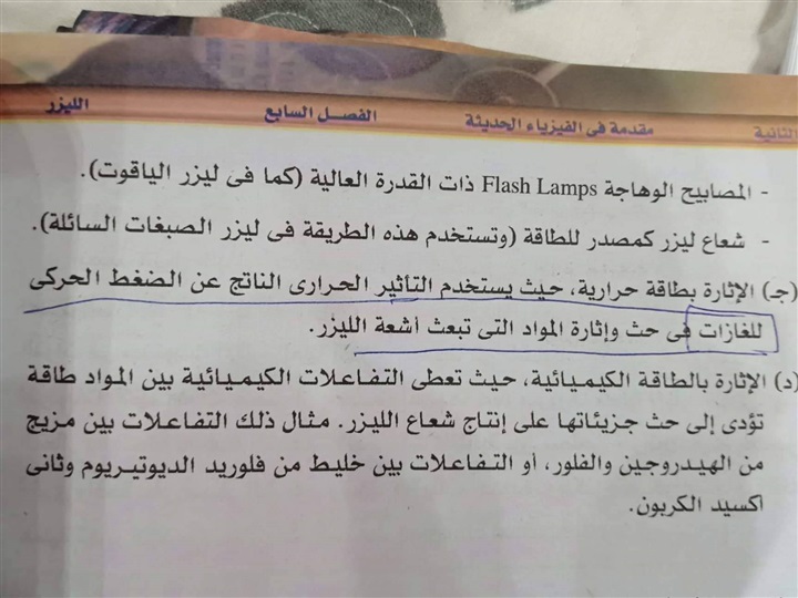 وأكد الطلاب أن إجابة السؤال تحتمل اجابتين من داخل كتاب المدرسة، مؤكدين أن المقارنة على مصدر الطاقة، فان ليزر الارجون يعد طاقة كهربائية أو طاقة حرارية نتيجة احتكاك وتفاعل الغازات، وبالتالي الاجابة هتكون طاقة كهربائية،