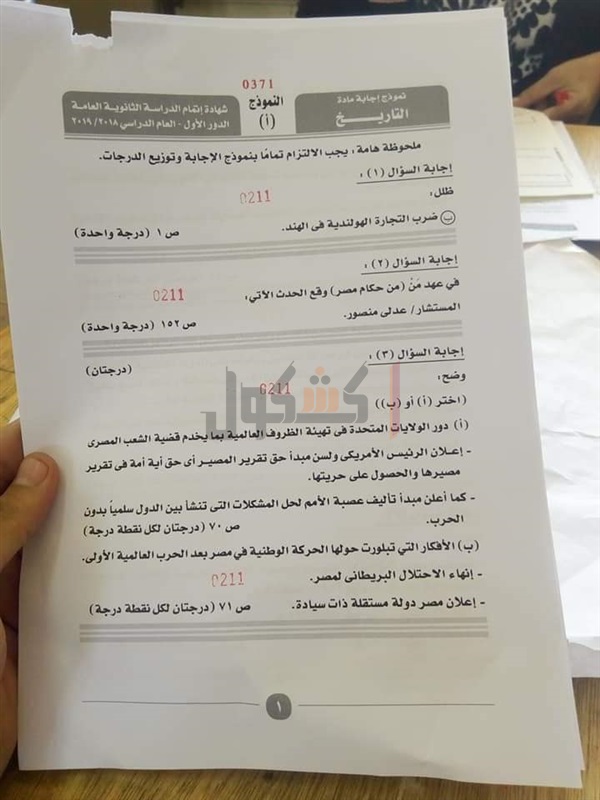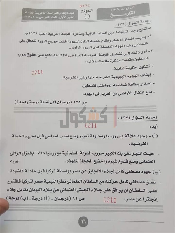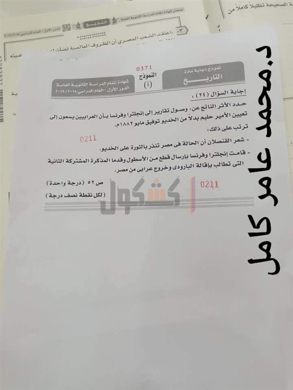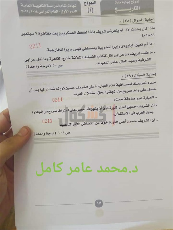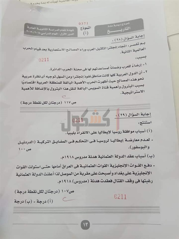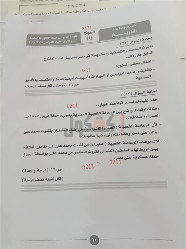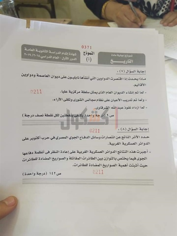 نموذج إجابة امتحان التاريخ للصف الثالث الثانوي 2019
