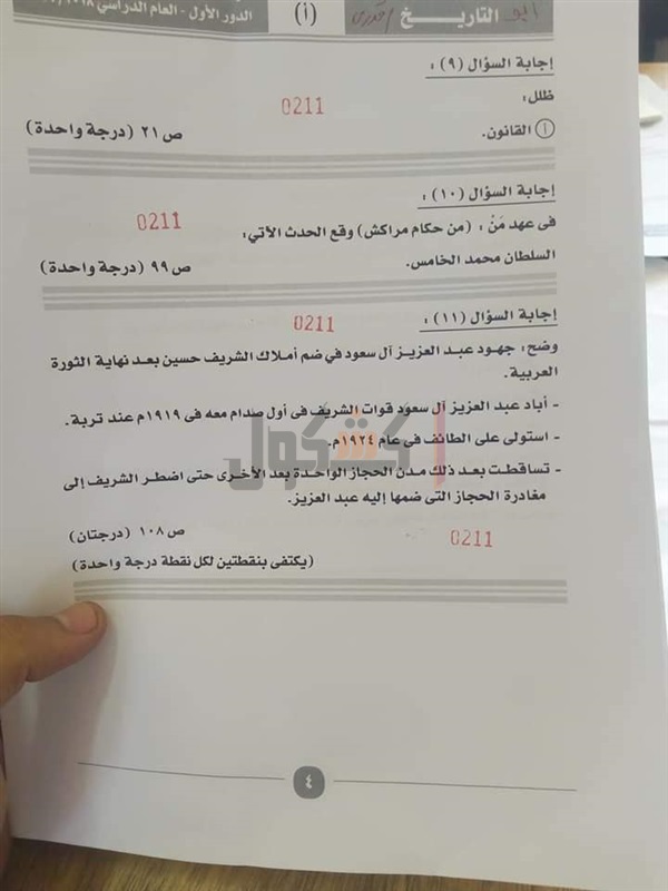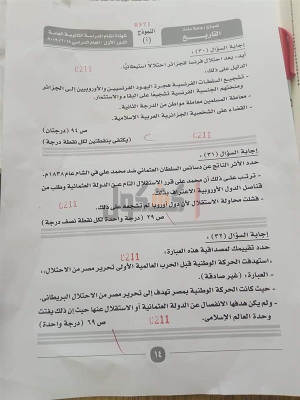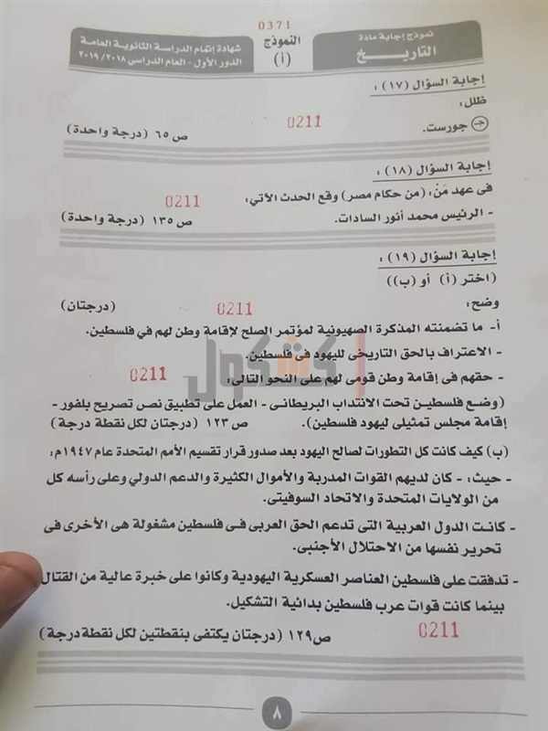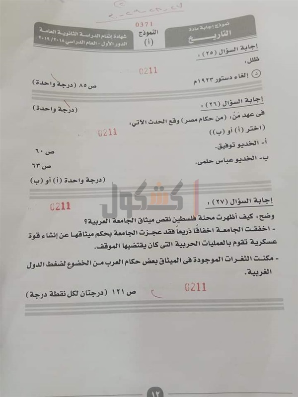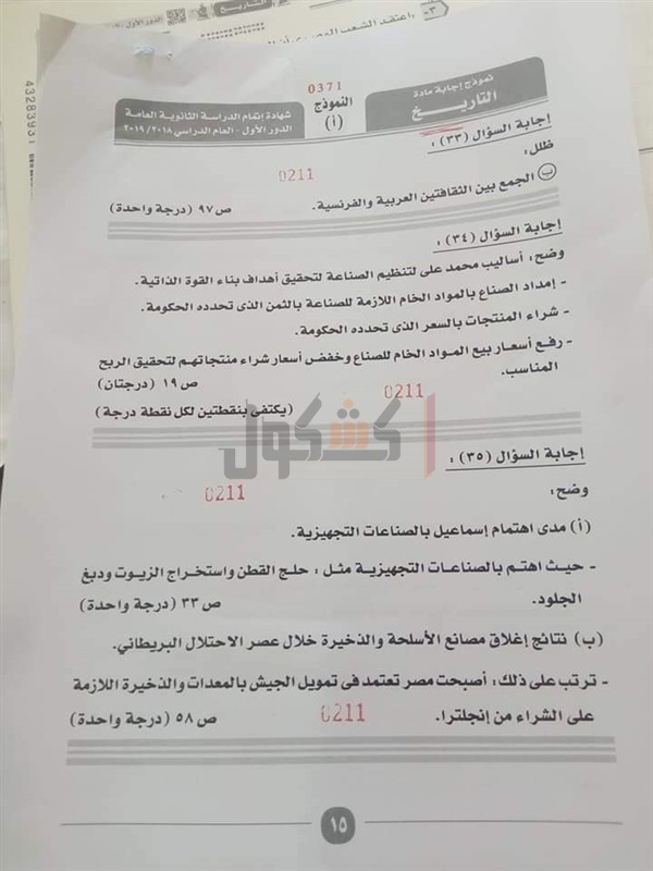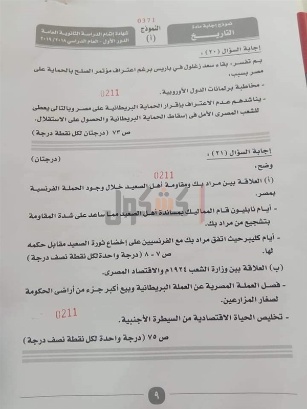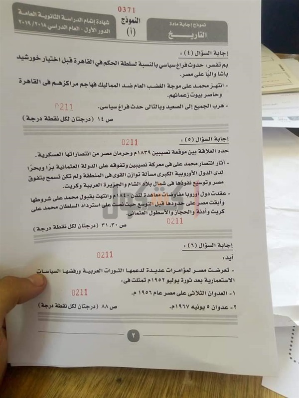 نموذج إجابة امتحان التاريخ للصف الثالث الثانوي 2019