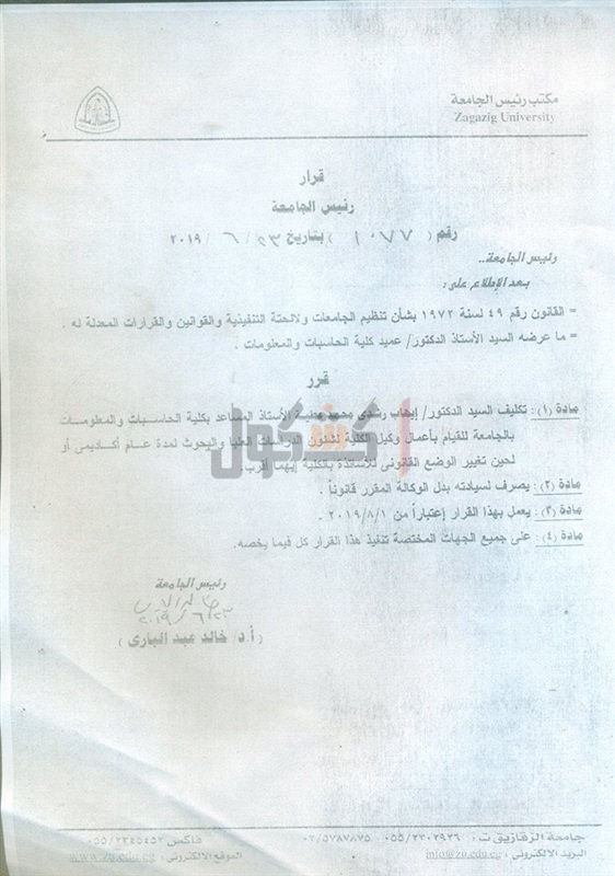أصدر الدكتور خالد عبد الباري رئيس جامعة الزقازيق القرار رقم 1077 بتاريخ 23 يونية 2019 تكليف الدكتور إيهاب رشدي محمد عطية الأستاذ المساعد بكلية الحاسبات والمعلومات بالجامعة للقيام بأعمال وكيل الكلية لشئون الدراسات العليا والبحوث لمدة عام أكاديمي أو لحين تغيير الوضع القانوني للأساتذة بالكلية أيهما أقرب.