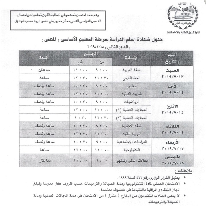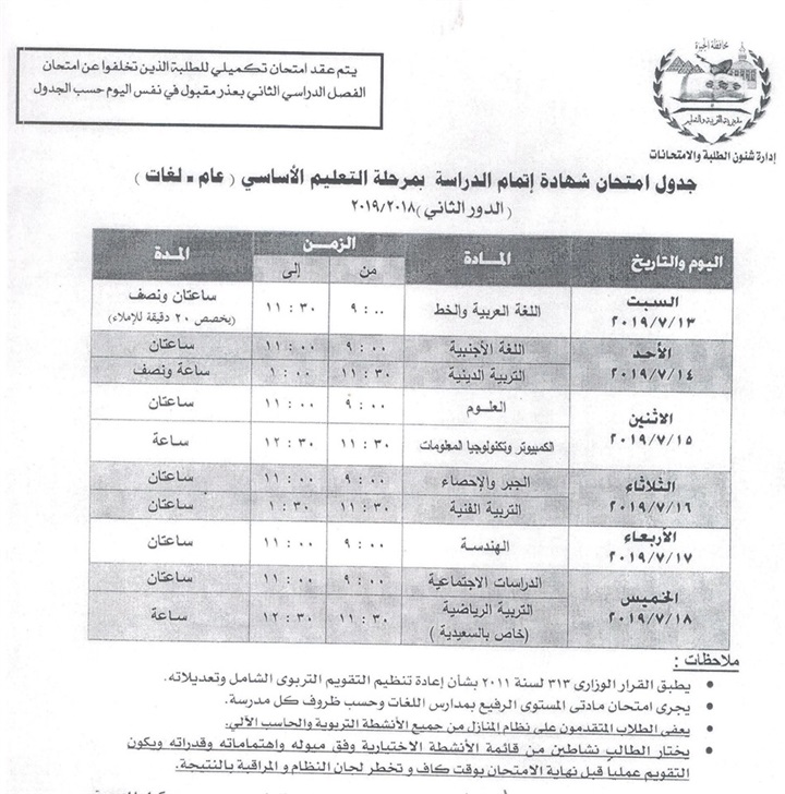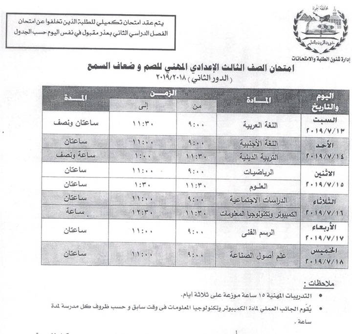 كما حددت المديرية مواعيد امتحانات الشهادة الإعدادية بمرحلة التعليم الأساسى (عربي – لغات) للدور الثاني بيوم السبت الموافق 2019/7/13 وتنتهي يوم الخميس الموافق 2019/7/18