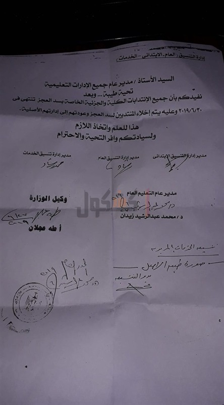 وأشار الخطاب الذي حصل "كشكول" على صورة منه، إلى أنه وفقاً لذلك يتم اخلاء المنتدبين لسد العجز وعودتهم إلى إداراتهم الأصلية.