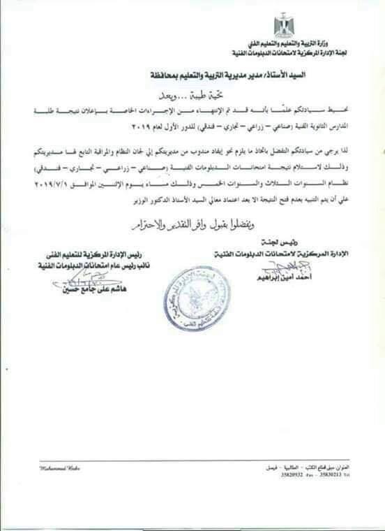 أنهت وزارة التربية والتعليم و التعليم الفني استعداداها لإعلان نتيجة امتحانات الدبلومات الفنية التي انطلقت يوم ١٨ مايو الماضي وانتهت ١يونيو في التخصصات الزراعية والصناعية والفندقية والتجارية.