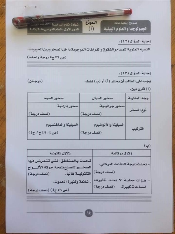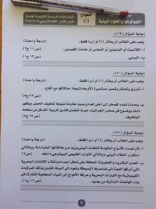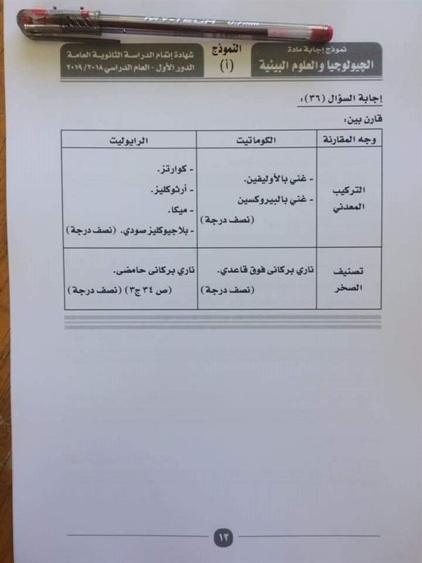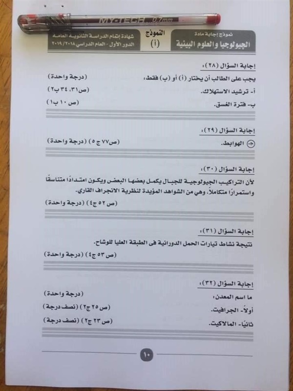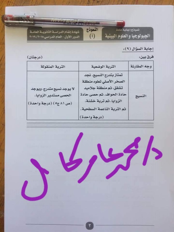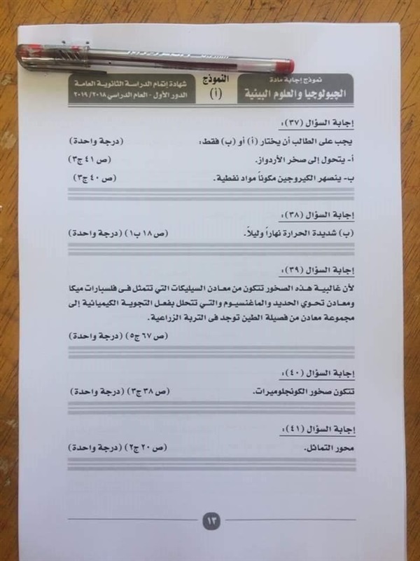 نموذج إجابة امتحان الجيولوجيا للثانوية العامة 2019