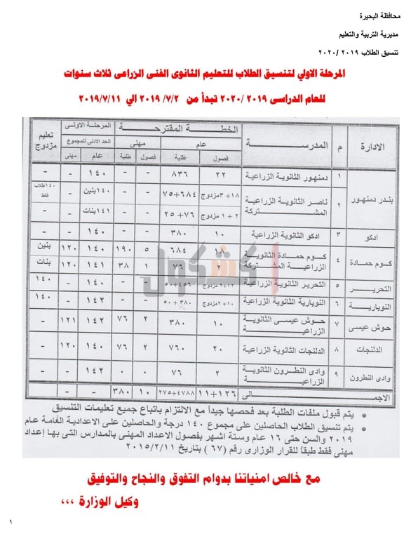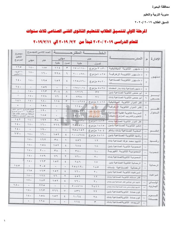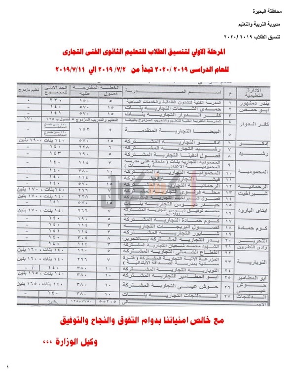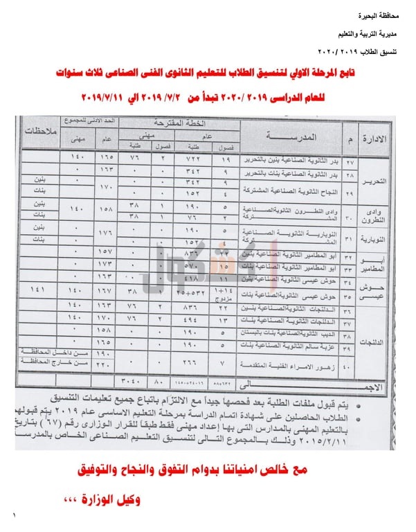 الفنى"الصناعي،التجاري,الزراعي" للعام الدراسي 2019/2020، حيث جاءت كالتالي: