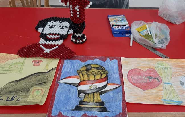 تضمنت الورشة، عددًا من الأعمال الفنية واللوحات التي رسمها الطلاب تعبيرًا عن حبهم لمنتخب بلادهم، ودعمهم وتشجيعهم الكامل للاعبيه.